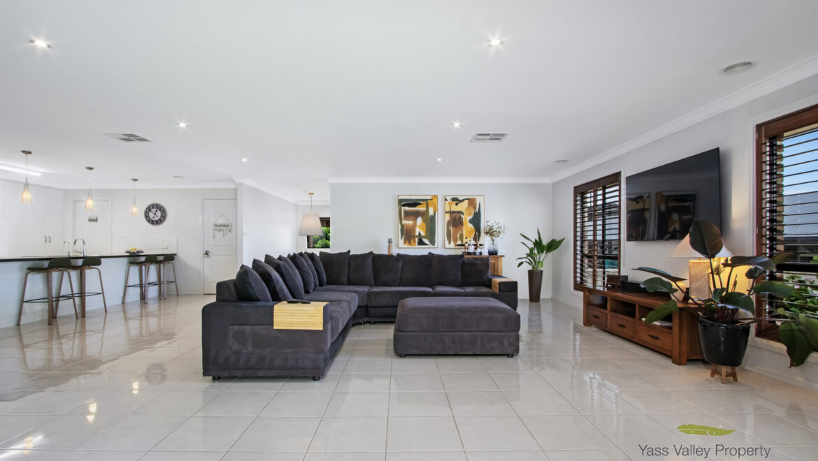 *Open plan family living, Dining, tiled, LED lights, plantation shutters, stacker glass and screen doors to alfresco