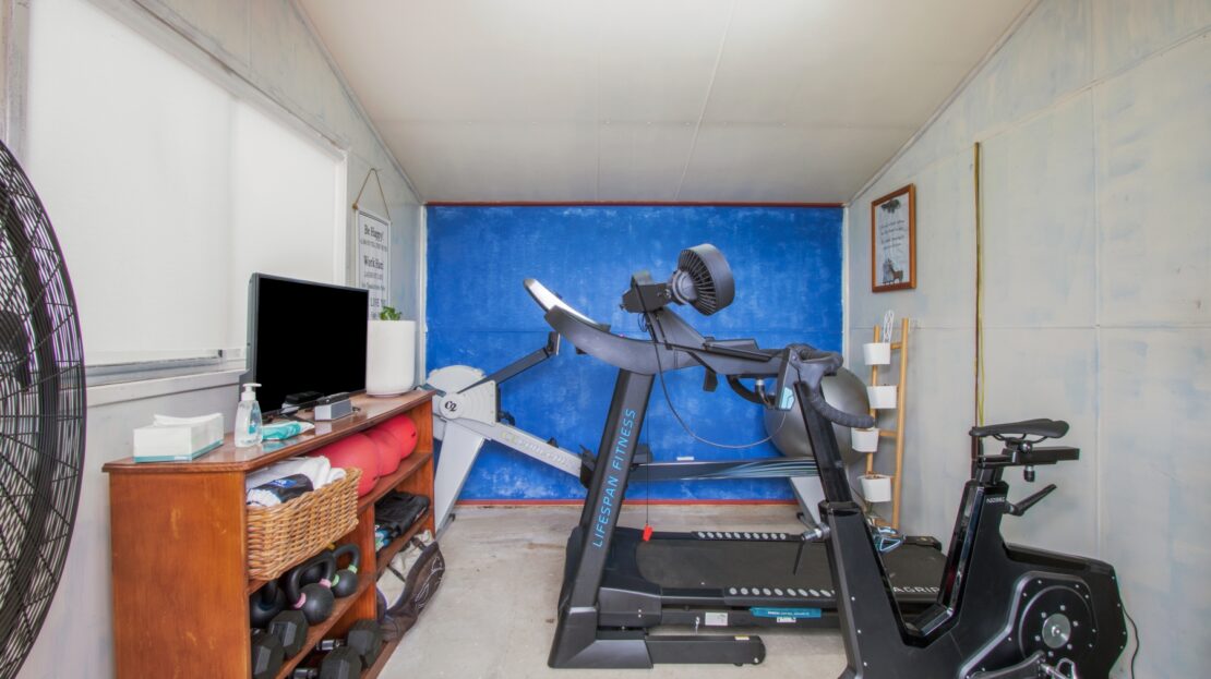Single car garage with gym at the rear, carport at front, concrete floor & electricity