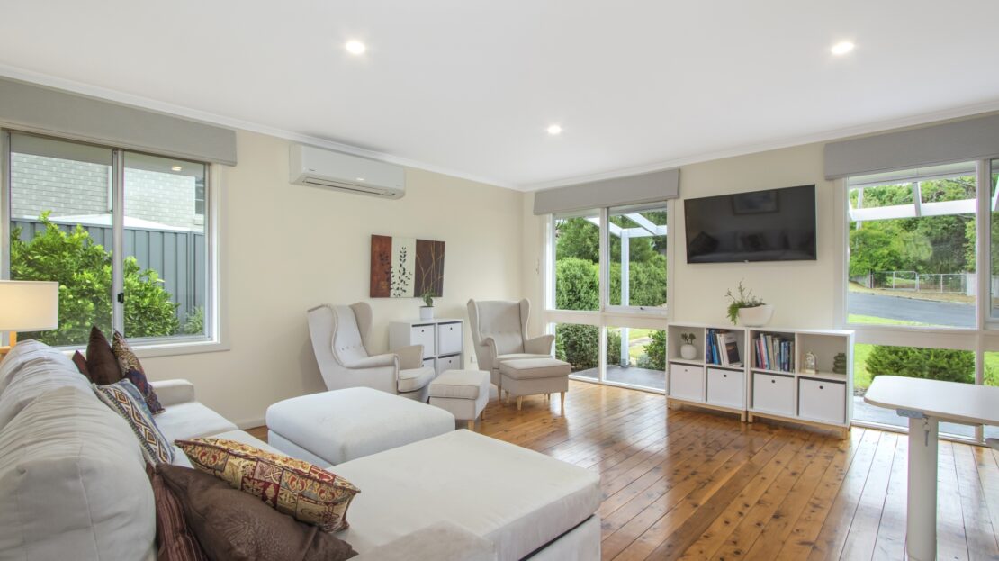 The lounge room looks onto the front garden and Short Street, polished cyprus floors, RCAC, and full of natural light