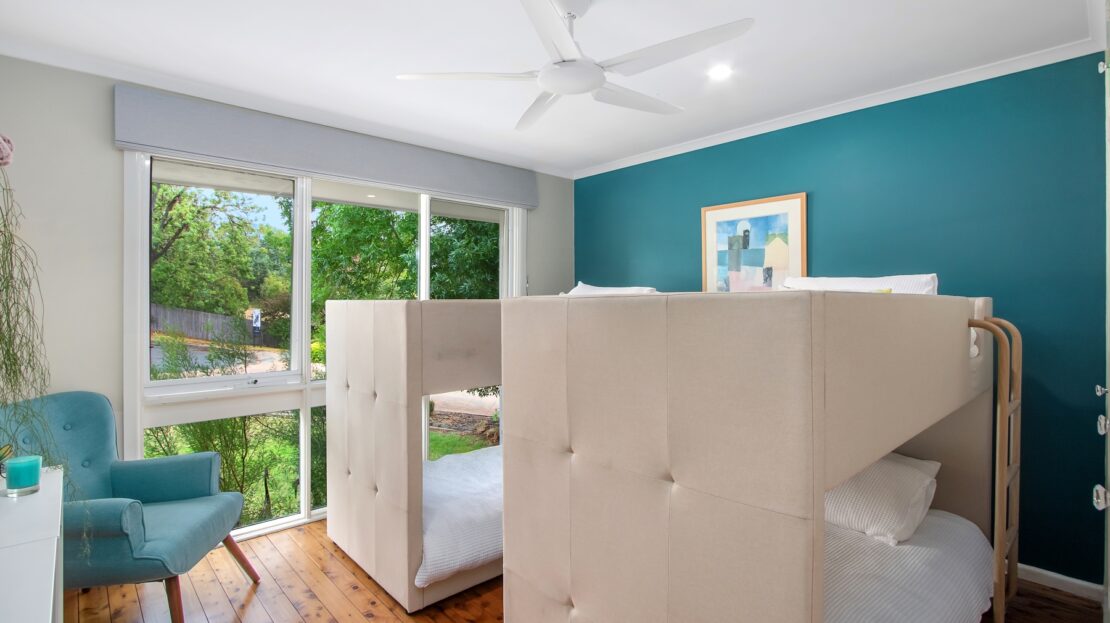Three kids’ rooms with polished timber floors, ceiling fans, two with built in robes