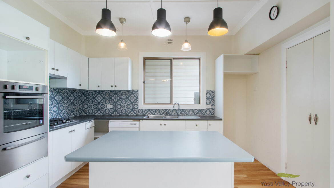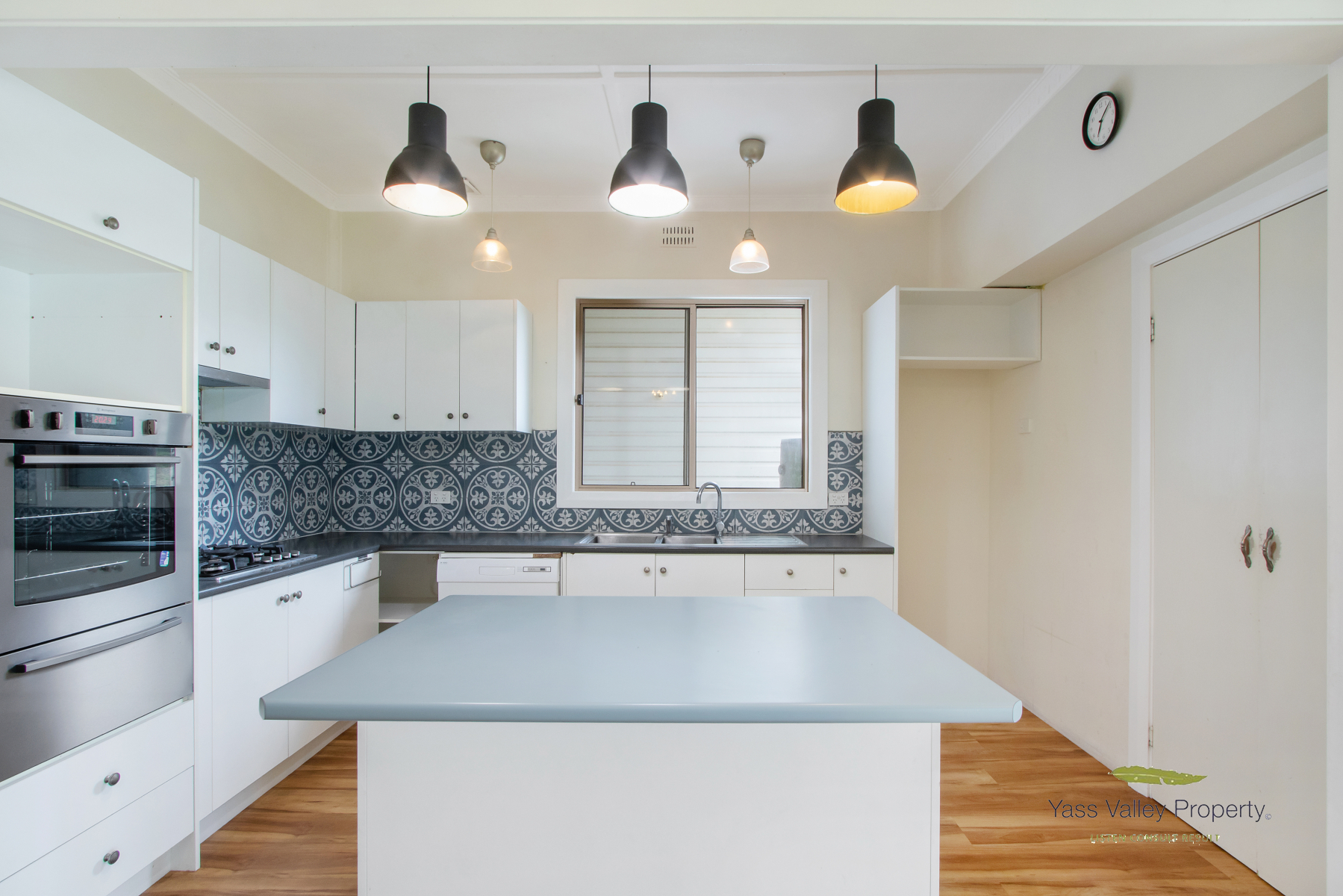 *Kitchen with island bench, wall electric oven, gas stove top, DW, pantry