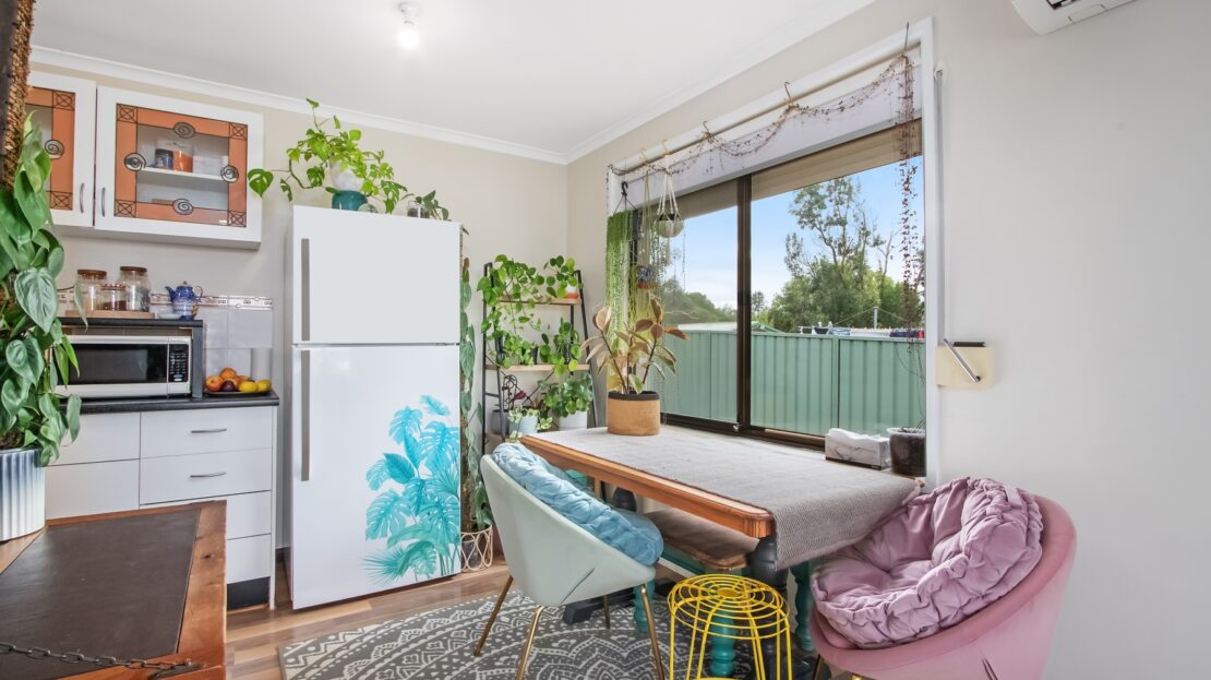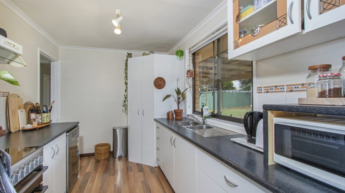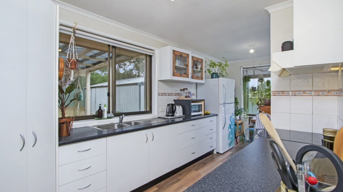 Renovated kitchen overlooking the back yard and covered entertaining area.