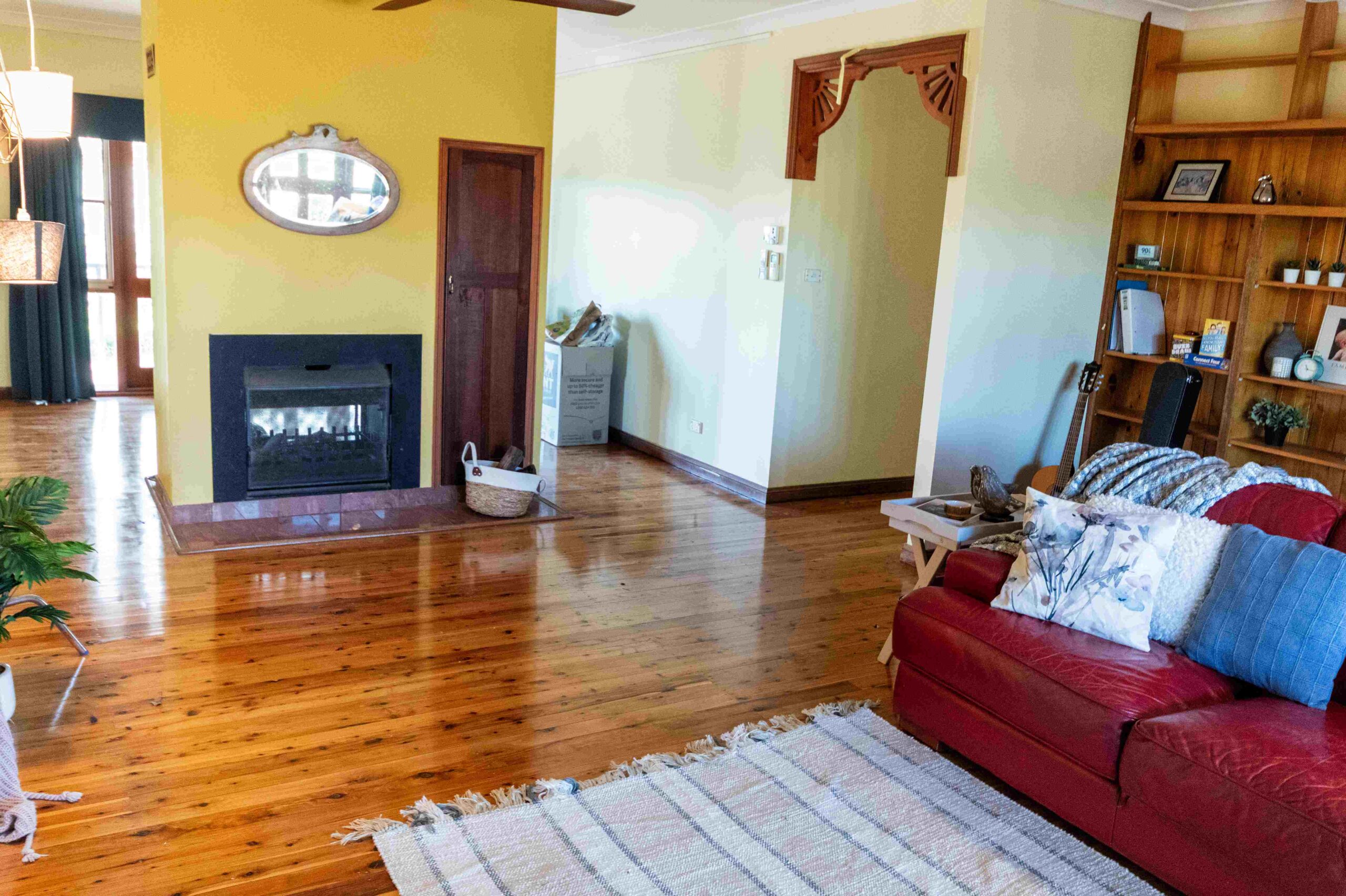 * Loungeroom: French windows, enclosed fireplace, built in bookcase