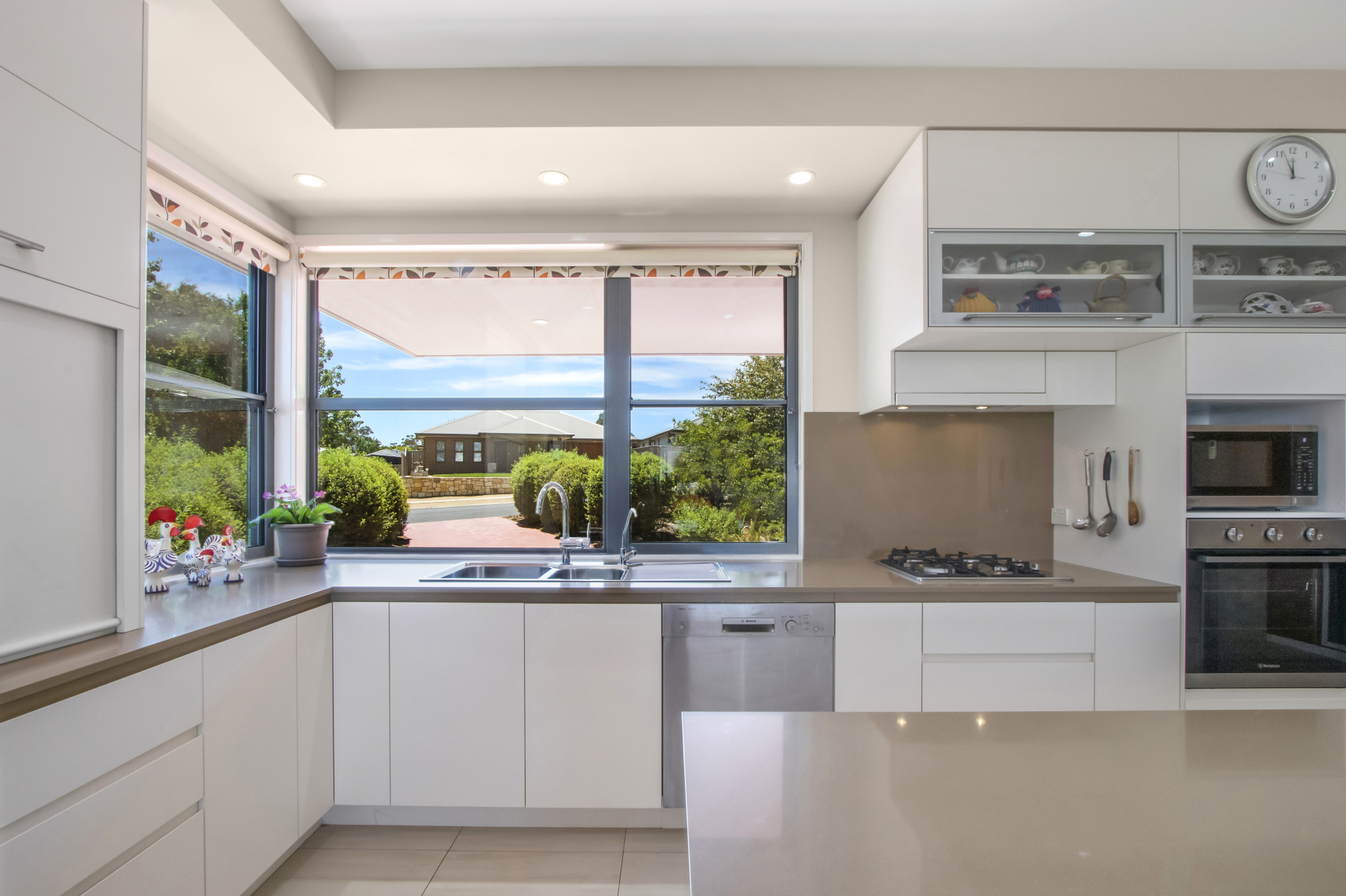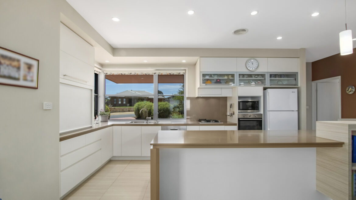 The kitchen catches the morning sun, 10 mm stone bench tops, soft close drawers, hideaway appliance cupboard, 1 ½ sink, dishwasher, gas cook top, electric oven, breakfast bar, walk in pantry