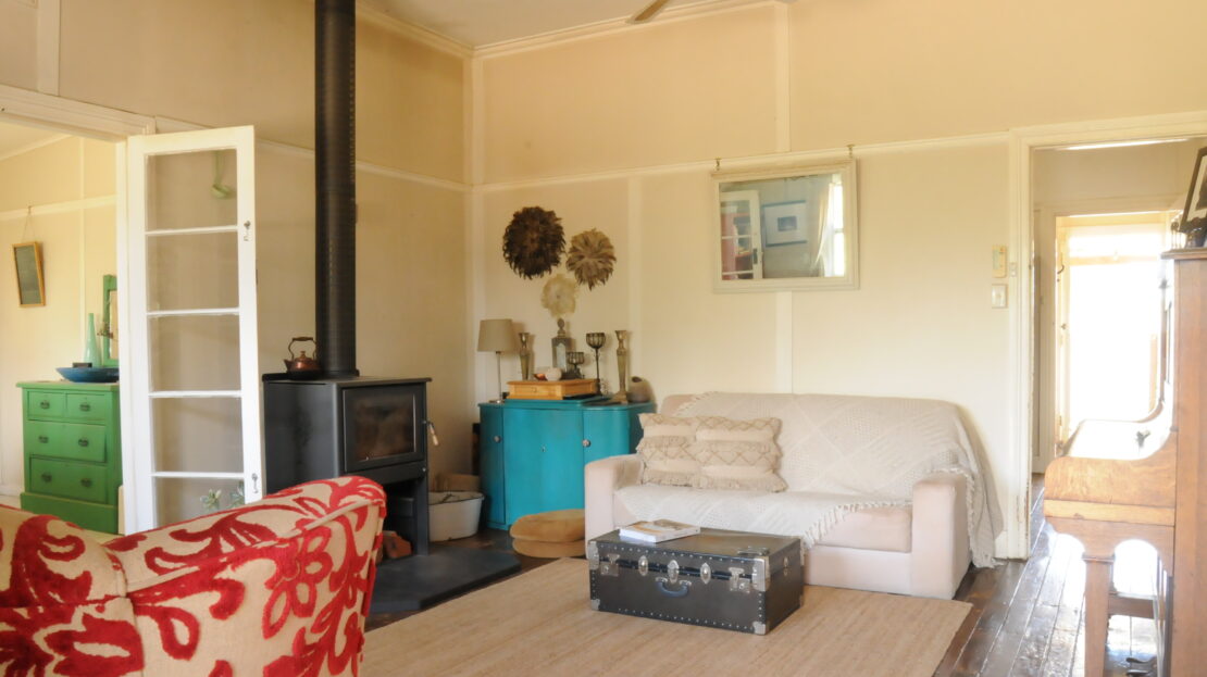 You enter into the lounge room with slow combustion wood heater, RCAC, polished hardwood floors