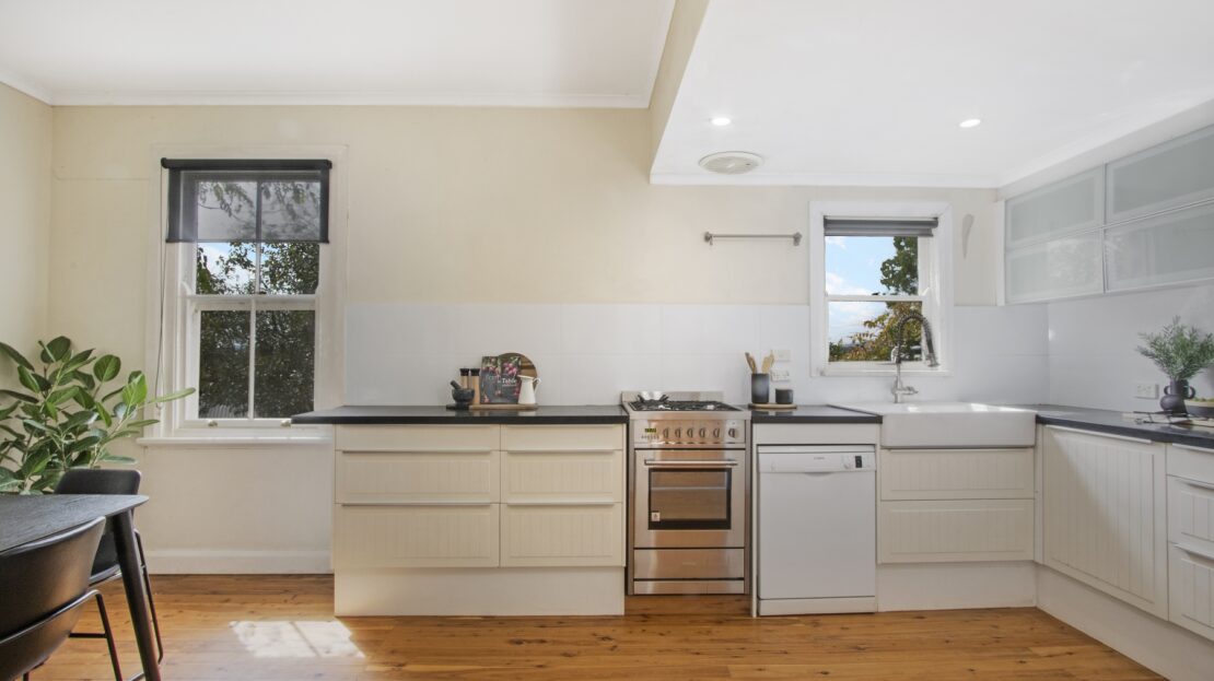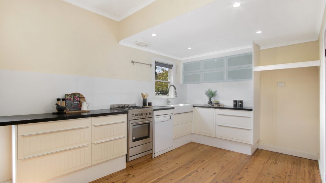 Renovated open plan kitchen with double ceramic sink, stone benchtops, soft close drawers, pantry, polished cyprus floors