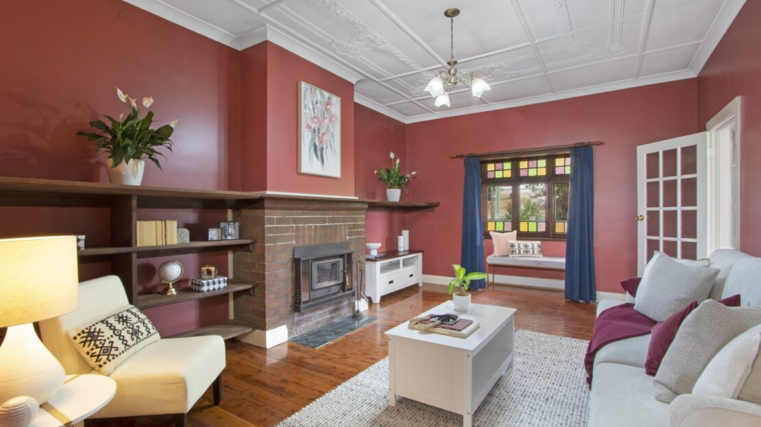 Large lounge room with high, ornate ceiling, slow combustion wood heater, stained glass windows a beautiful space to relax & unwind