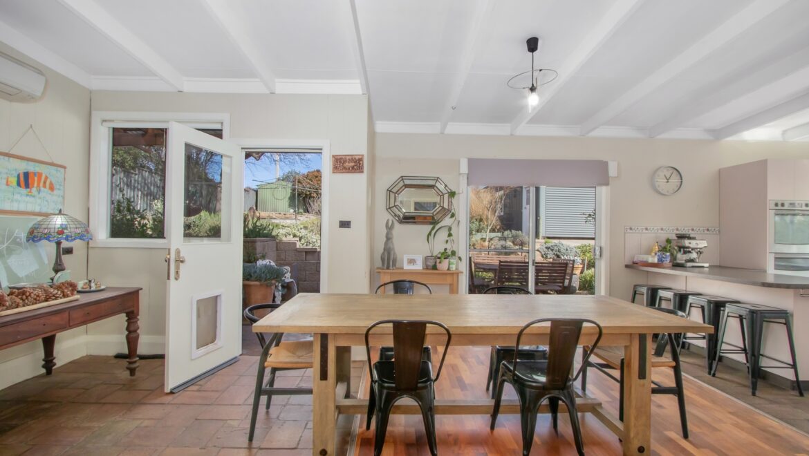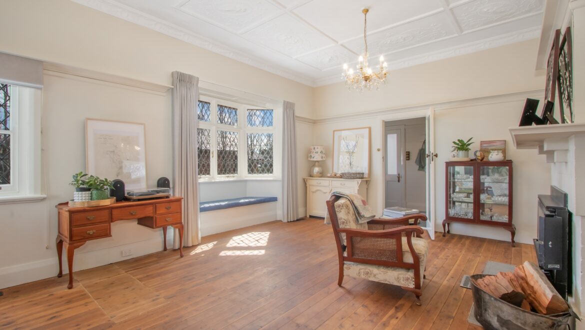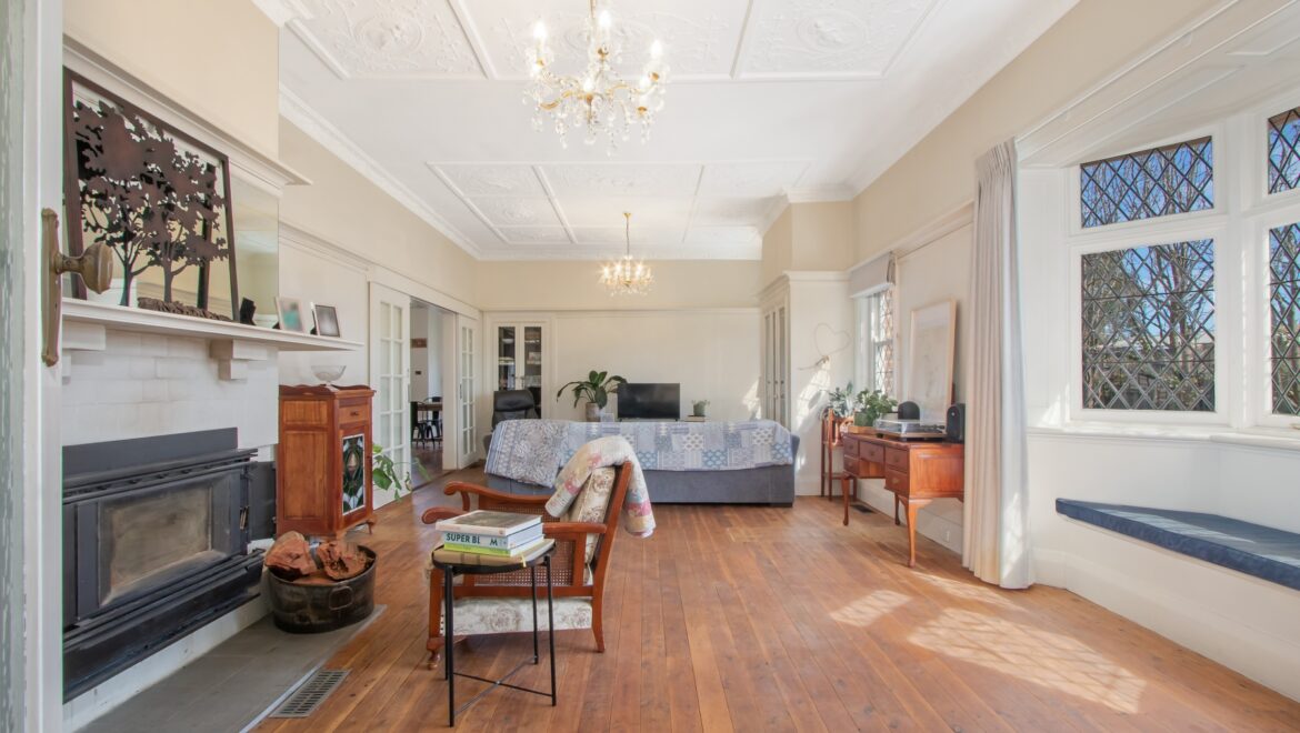 And from here you enter the large dining room, with stunning north facing diamond leadlight windows, high ornate ceilings, exposed cyprus floors and a slow combustion wood heater