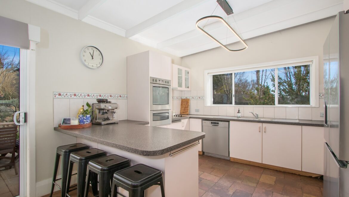 Light filled north facing kitchen with breakfast bar, electric oven & grill, electric cooktop, double sink, Bosch dishwasher, slate floor & double fridge space