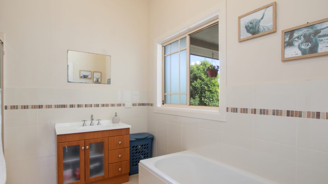 The kitchen is a standout, featuring thick hardwood benchtops, a 900mm electric oven with a gas cooktop, range hood, dishwasher, 1 ½ sink, and a breakfast bar. It seamlessly flows into the large open plan dining and family room, which is warmed by a feature fireplace and cooled by reverse cycle air conditioning (RCAC). The two-way family bathroom adds convenience, while the spacious master bedroom offers a walk-in robe, built-in robes, and a private ensuite with a double shower.