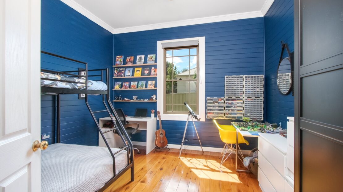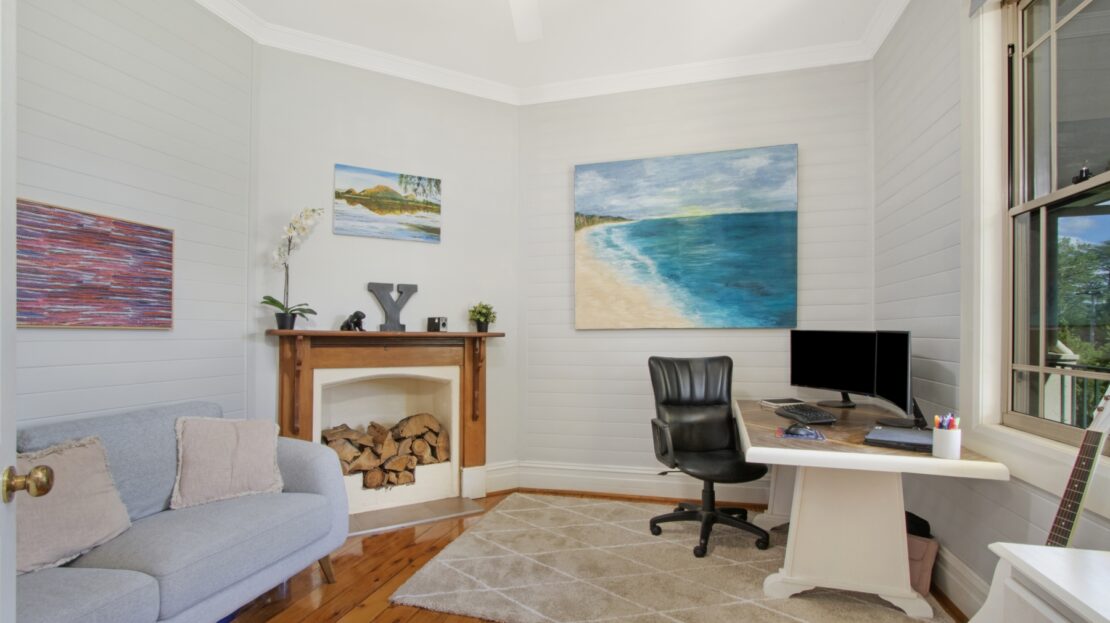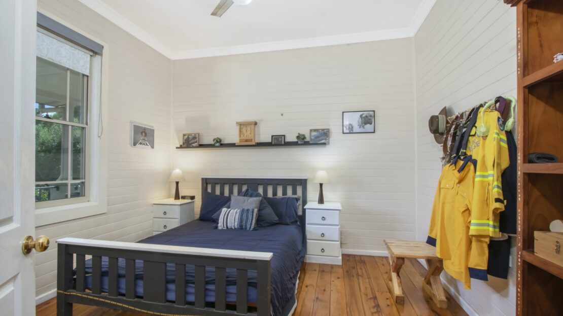 Inside, both front bedrooms are spacious, light-filled, and feature polished Cyprus timber floors, with one bedroom showcasing a feature fireplace. Timber lining boards in the hallway and high ceilings throughout add to the home’s appeal. The third bedroom, perfect for children, is located off the lounge and also boasts polished floorboards. The inviting lounge room includes a slow combustion wood heater, polished floors, and opens directly onto the veranda, making it perfect for both relaxation and entertaining.
