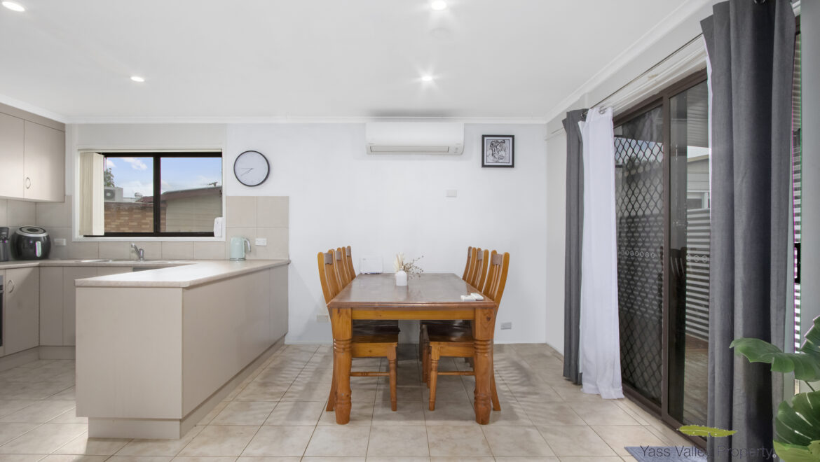 *Combined dining and kitchen, RCAC, breakfast bench, under bench electric oven, electric glass stove top, dish washer, views over the rear yard, plenty of cupboard space