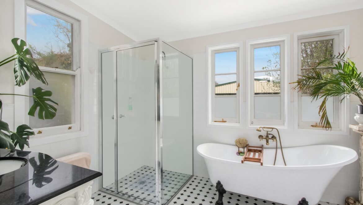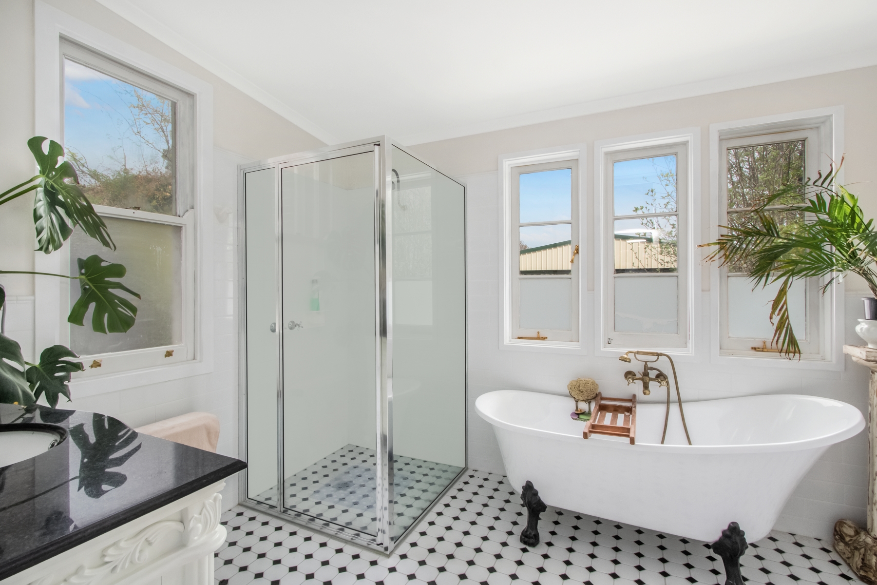 Family bathroom with linen press, claw foot bath, shower, toilet, feature vanity with stone bench top