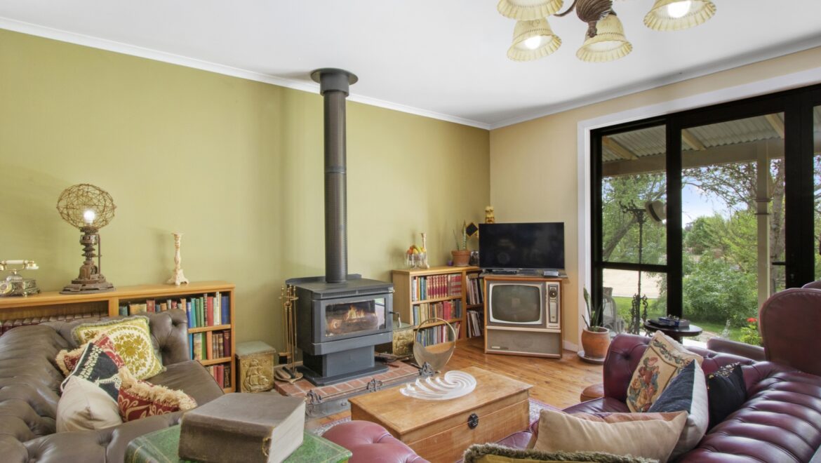 Family room open plan from the kitchen, slow combustion wood heater opens to covered front deck overlooking the garden
