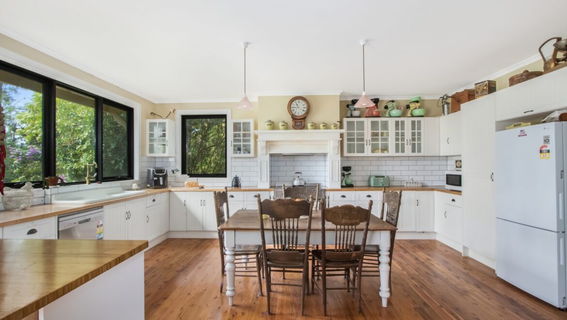 Large country open plan kitchen with plenty of bench space, cast iron sink, dishwasher, 900 mm over & cooktop RCAC