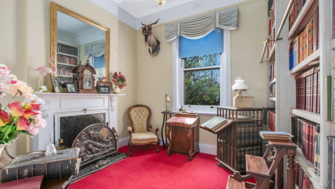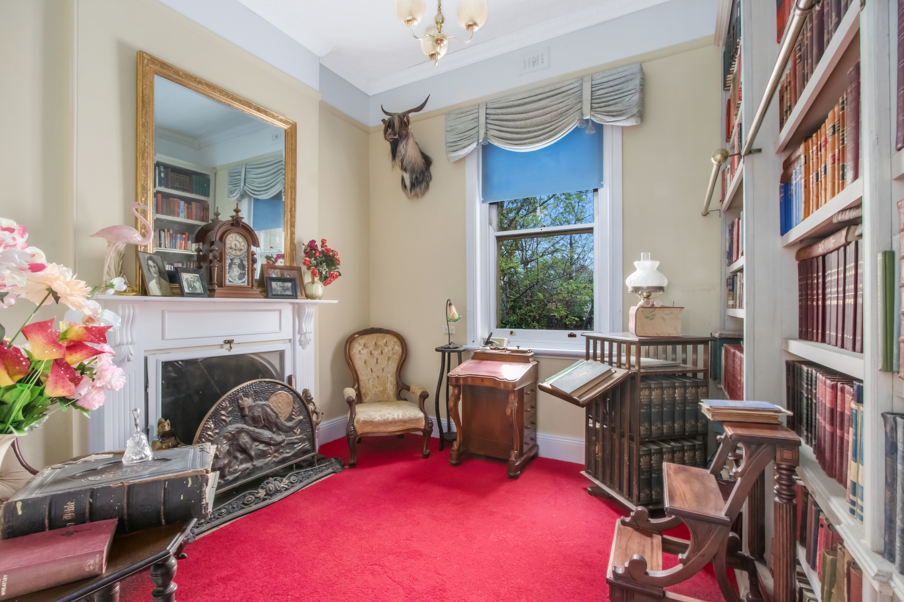 Library with open fire and pressed metal ceilings, floor to ceiling bookcase