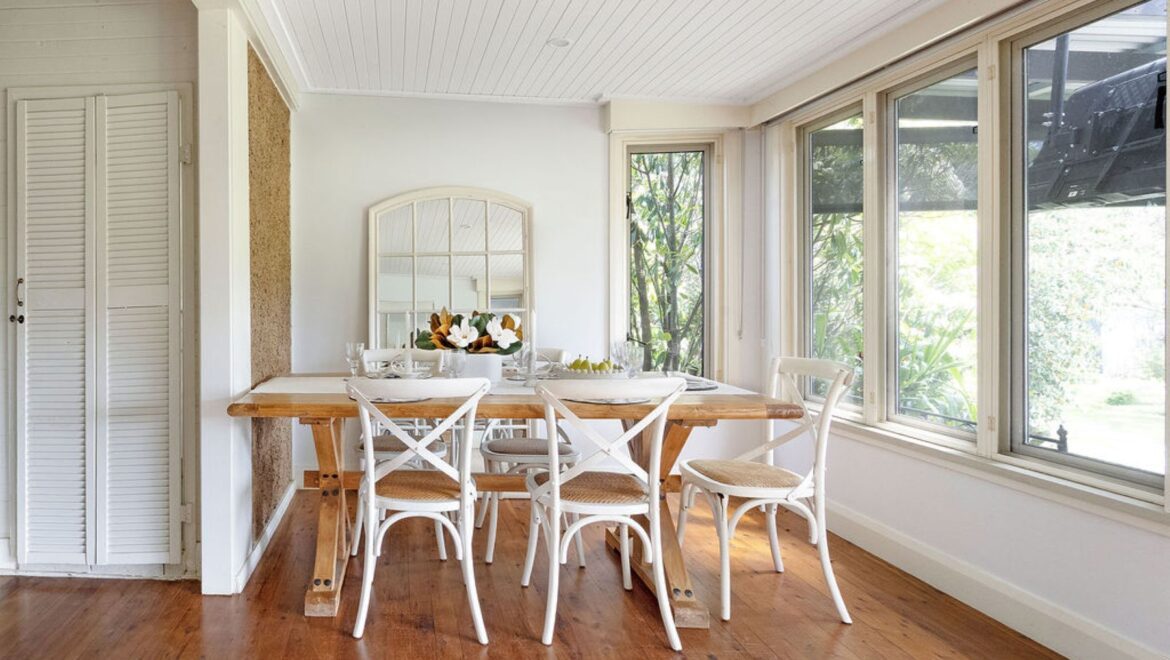*Dining area with double glazed picture pivot opening windows, framing views over the backyard and surrounding hills