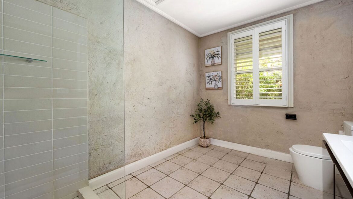 *Spacious bathroom with shower, vanity and WC, plantation shutter plus ample room to add a freestanding bathtub