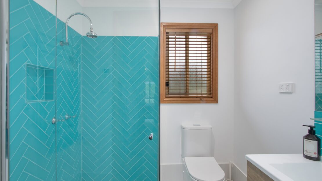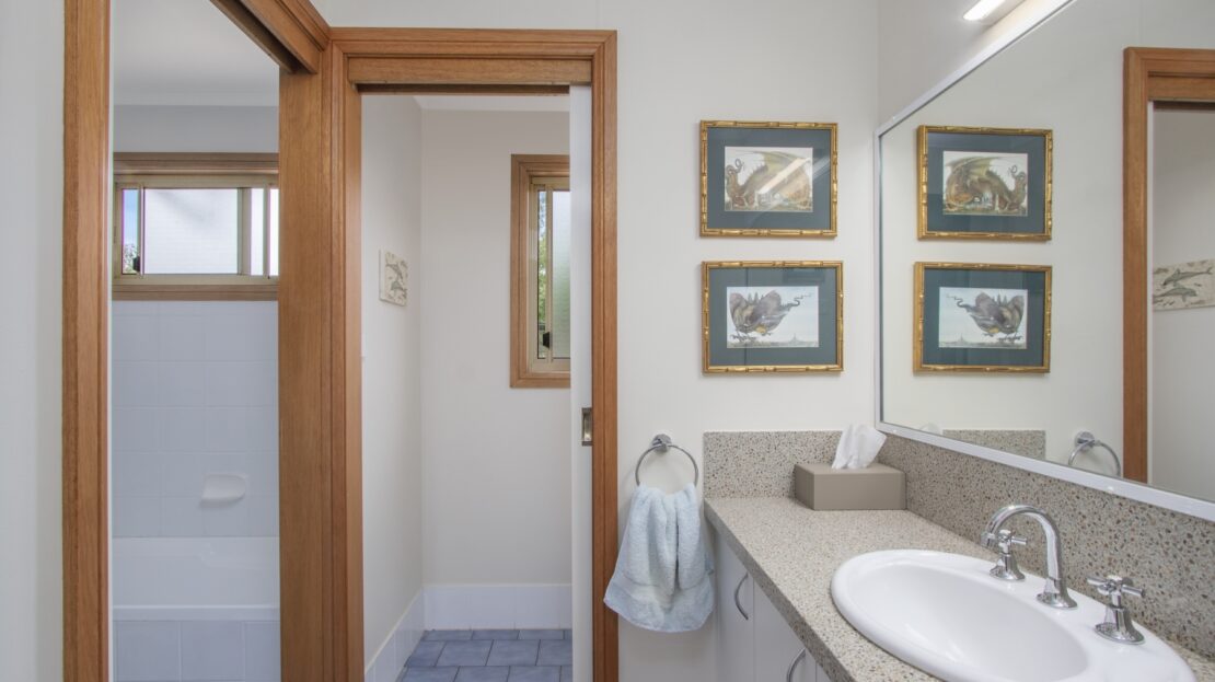 Three-way family bathroom with new granite benchtop on the vanity, shower & bath