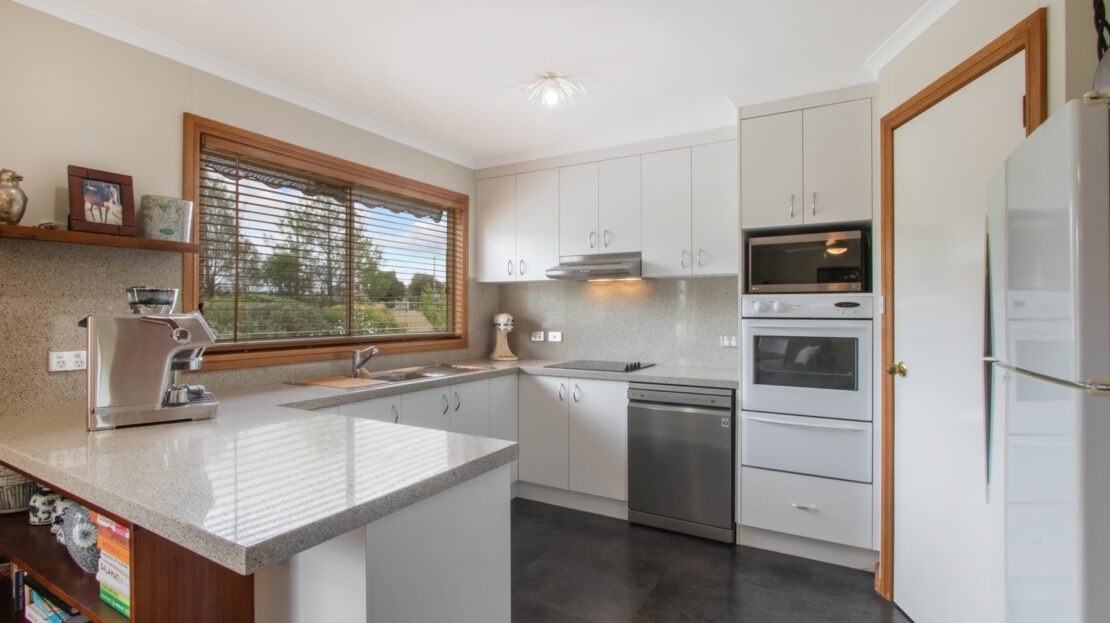 Kitchen with granite bench top and splash back, breakfast bar, electric cooking, pantry, double sink and dishwasher, opens to dining