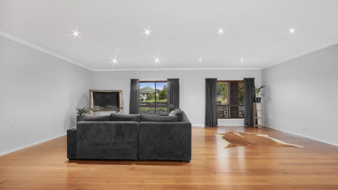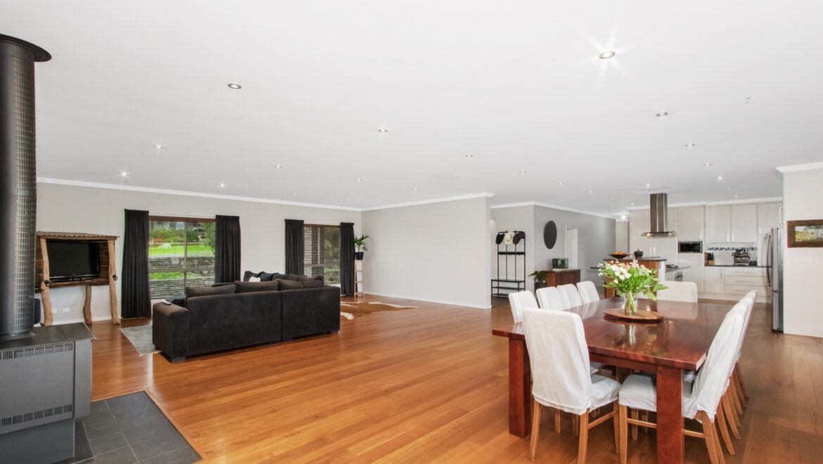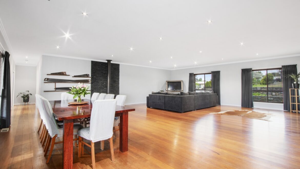 Large open plan family/dining room with polished yellow stringy bark floors