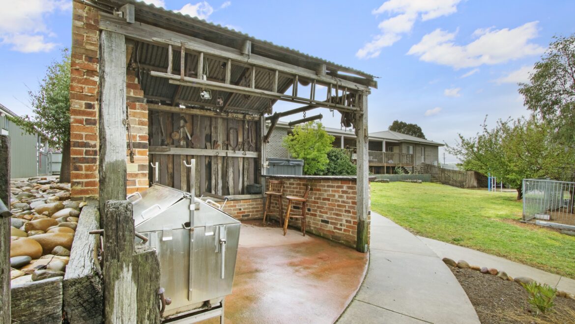 Outdoor BBQ area with brick open fire, feature timber bar