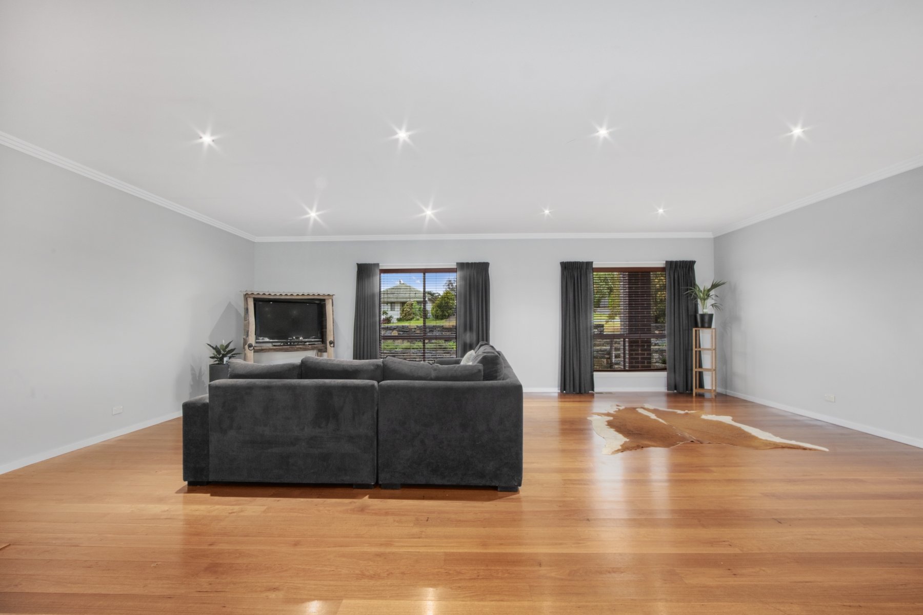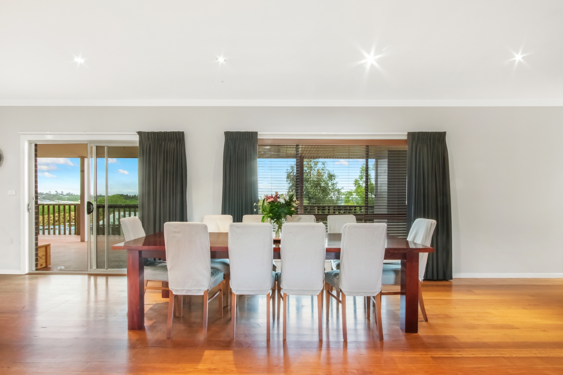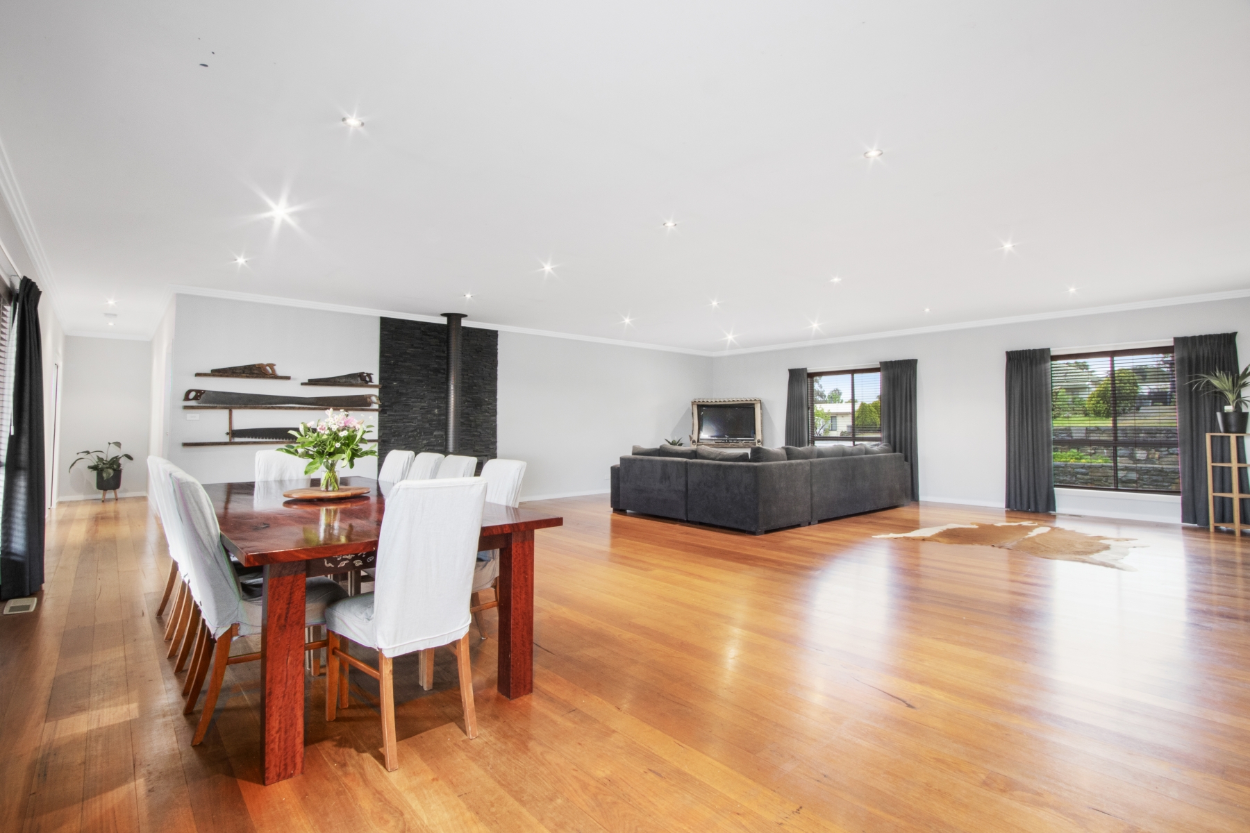 Large open plan family/dining room with polished yellow stringy bark floors