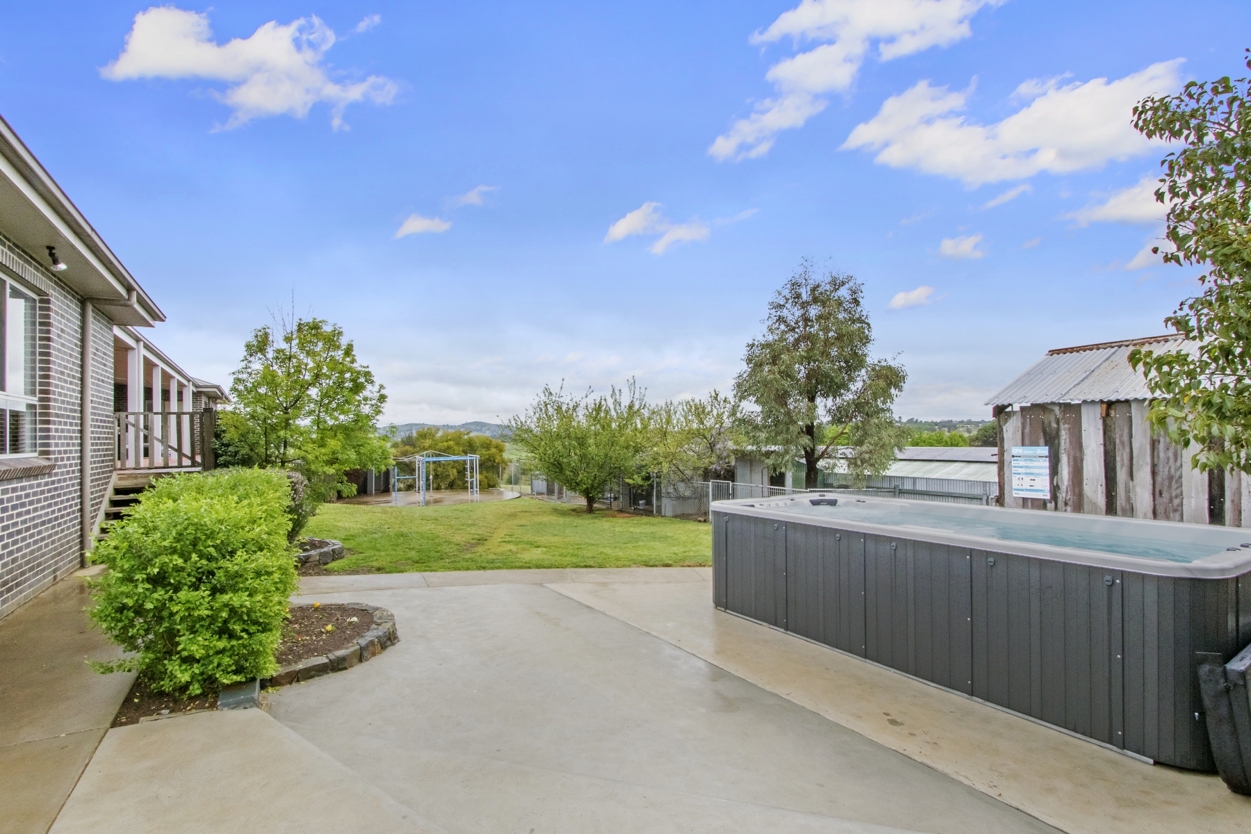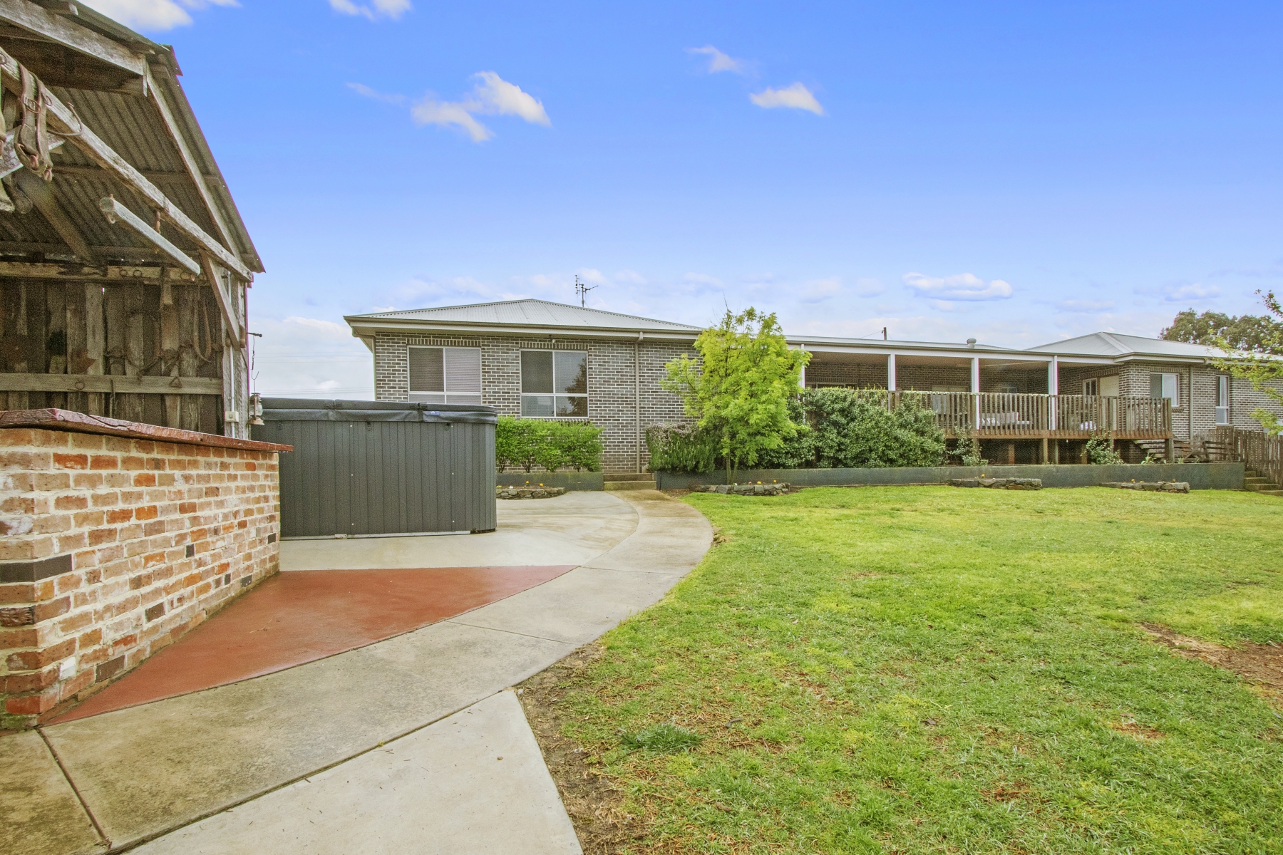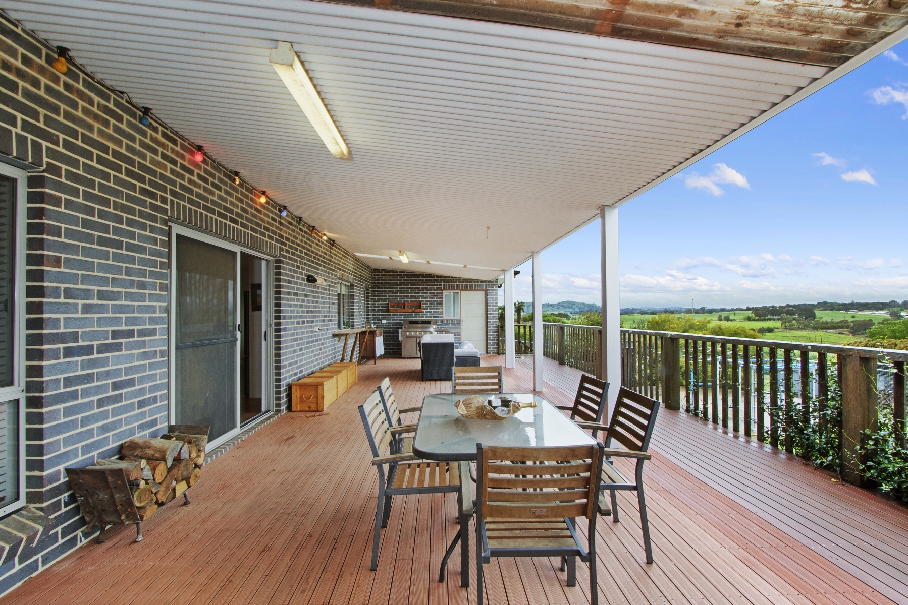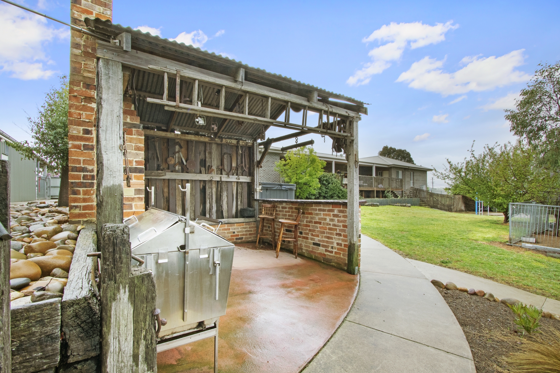 Outdoor BBQ area with brick open fire, feature timber bar