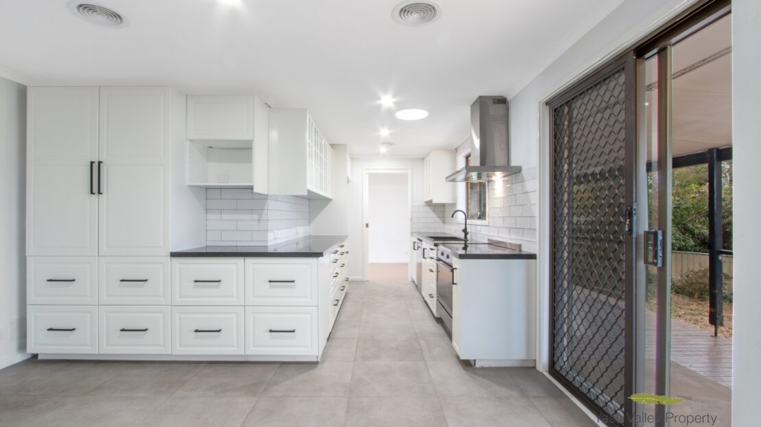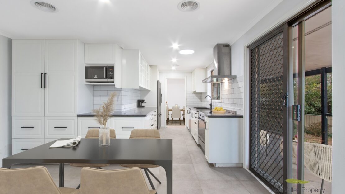 *Stylish, renovated Kitchen with 900mm stainless steel electric cooker, rangehood, dishwasher, stone benchtops, and access to the external deck
