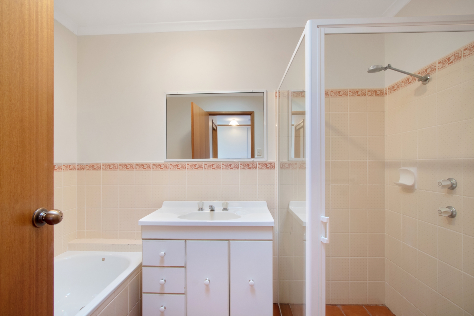 Two-way family bathroom is spacious, featuring both a separate shower and bath.